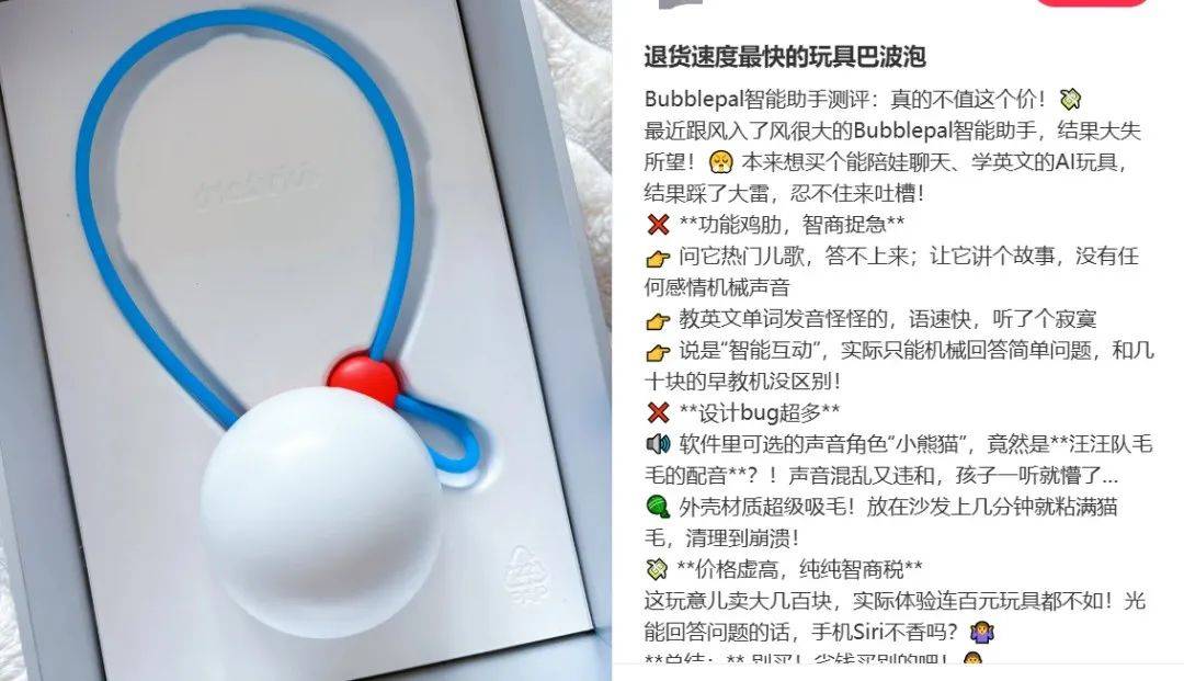 一位买过Bubblepal智能挂件的宝妈直言,种草时说是“智能互动”的玩具,买回来发现只能机械地回答简单问题,和几十块的早教机没什么区别。
